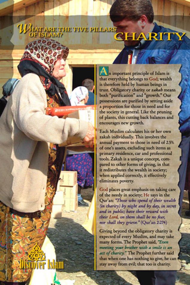 An important principle of Islam is that everything belongs to God; wealth is therefore held by human beings in trust. Obligatory charity or zakah means both "purifications" and "growth." Our possessions are purified by setting aside a proportion for those in need and for society in general. Like the pruning of plants, this cutting back balances and encourages new growth. Each Muslim calculates his or own zakah individually. This involves the annual payments to those in need of 2.5% of one's assets, excluding such items as primary residence, car and professional tools. Zakah is a unique concept, compare to other forms of giving, in that it redistributes the wealth of society; when applied correctly, it effectively eliminates poverty. God places great emphasis on taking care of the needy in society; He says in the Qur'an: "Those who spend of their wealth (in charity) by night and by day, and in secret and in public have their reward with their Lord, on them there shall be no fear, nor shall they grieve." (Qur'an 2:274) Giving beyond the obligatory charity is expected upon every Muslim and may take many forms. The Prophet said, "Even meeting your brother with a smile is an act of charity." The Prophet further said that when one has nothing to give, he can stay away from evil; that too is charity.